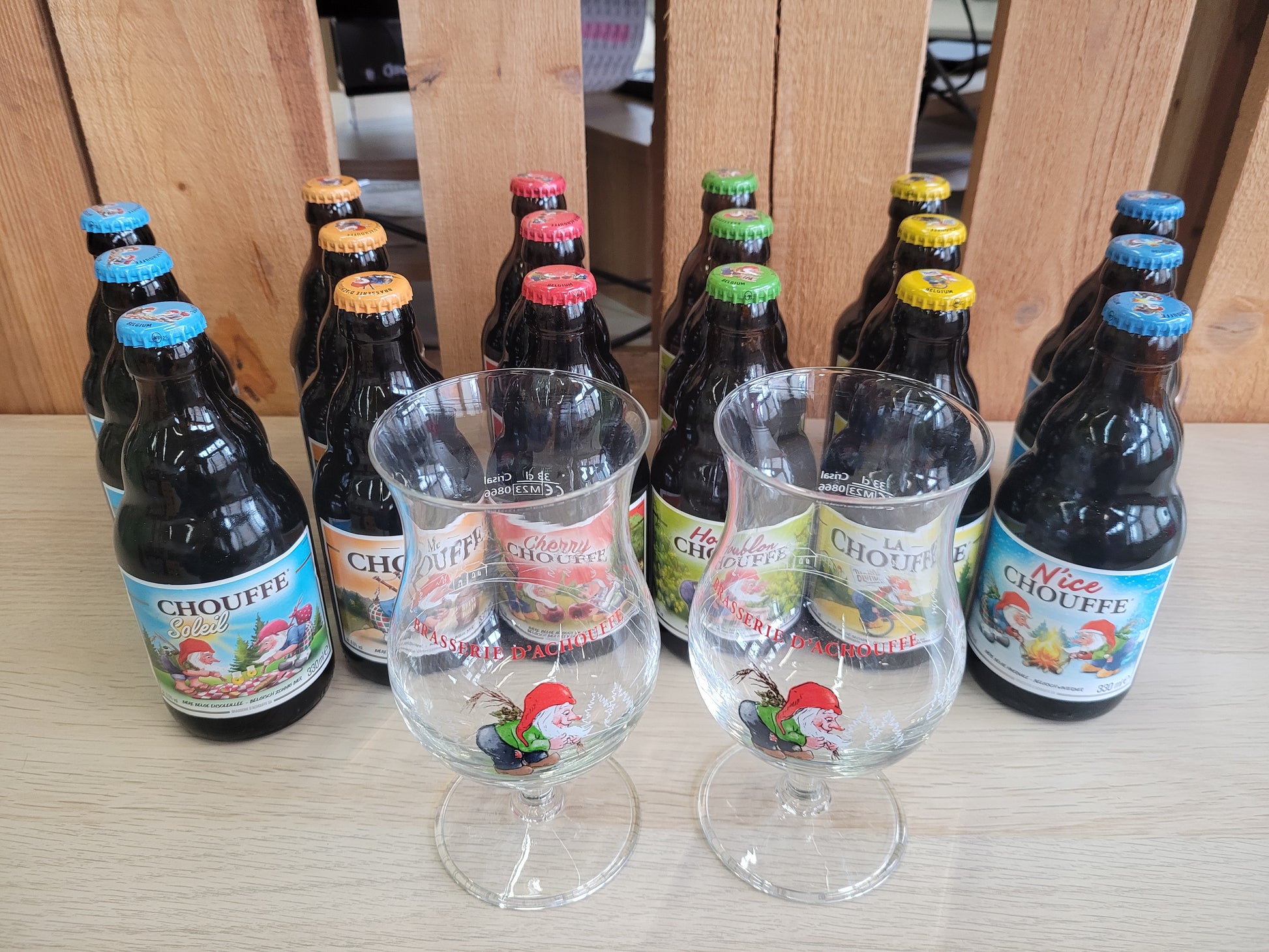 These dwarves are definitely something to behold! Or the whole dwarf family, like in our Chouffe box! Discover and enjoy the variety of the Achouffe brewery with two matching dwarf glasses, which introduce a new dwarf into the dwarf family for each of their beers. This is based on the legends from the community of origin in the Ardennes.