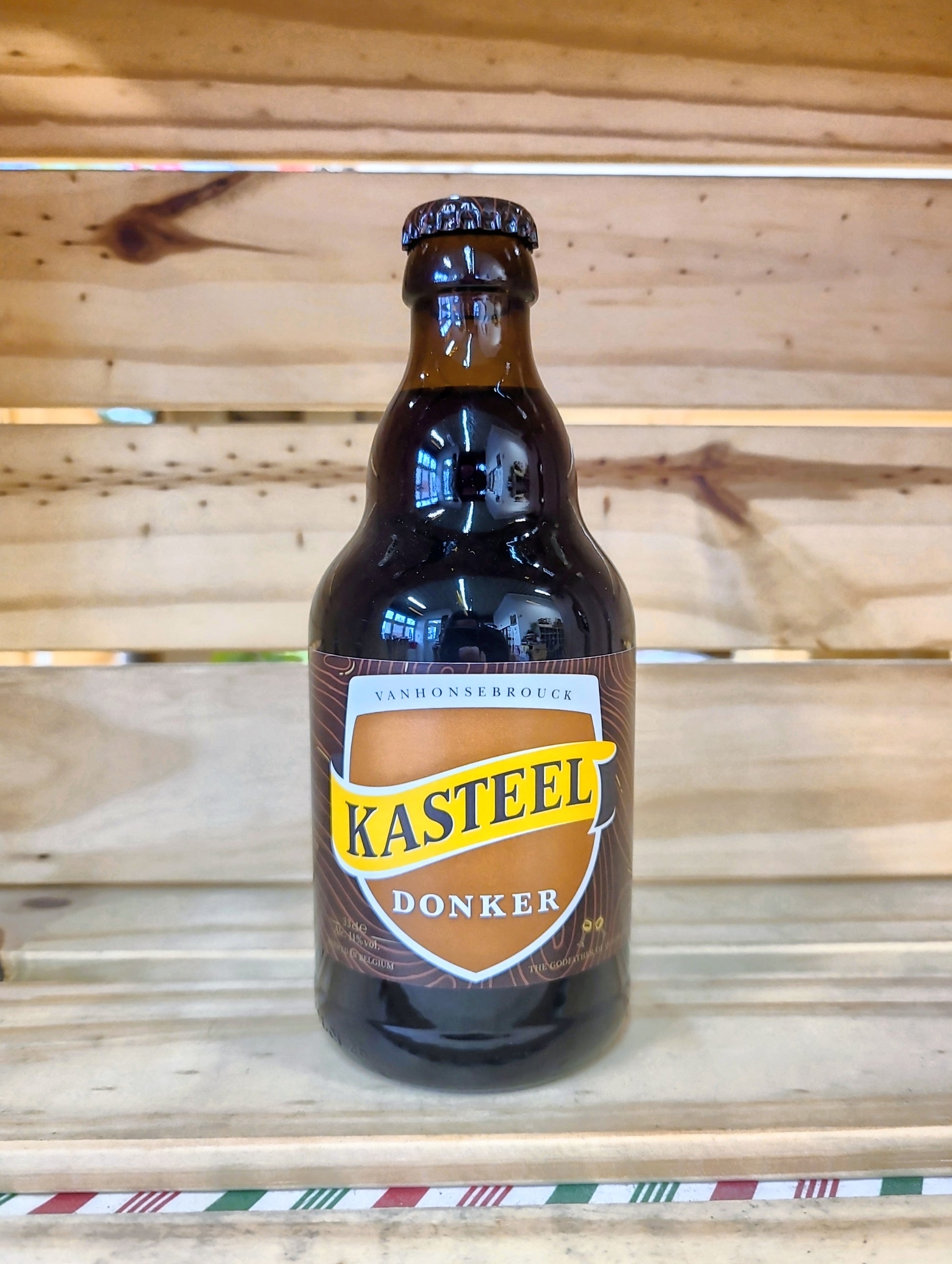 Kasteel Donker ist ein belgisches Starkbier, das in der Brouwerij Van Honsebrouck in Ingelmunster, Belgien, gebraut wird. Es hat einen Alkoholgehalt von 11%. Das Bier hat eine dunkle, mahagonibraune Farbe und eine dichte, cremige Schaumkrone. Der Geschmack ist reichhaltig und komplex mit Noten von Karamell, Schokolade, Trockenfrüchten und Gewürzen wie Nelken und Zimt. Kasteel Donker hat ein vollmundiges, cremiges Geschmacksprofil, das sich gut als Digestif oder Begleitung zu deftigen Speisen eignet. Es wird normalerweise in einem kelchförmigen Glas serviert, um das Aroma und den Geschmack des Bieres zu betonen. Kasteel Donker ist eine gute Wahl für diejenigen, die ein intensives und aromatisches Bier mit einer reichen, komplexen Geschmacksnote suchen. Es passt gut zu würzigem Käse, gegrilltem Fleisch und kräftigen Eintöpfen.