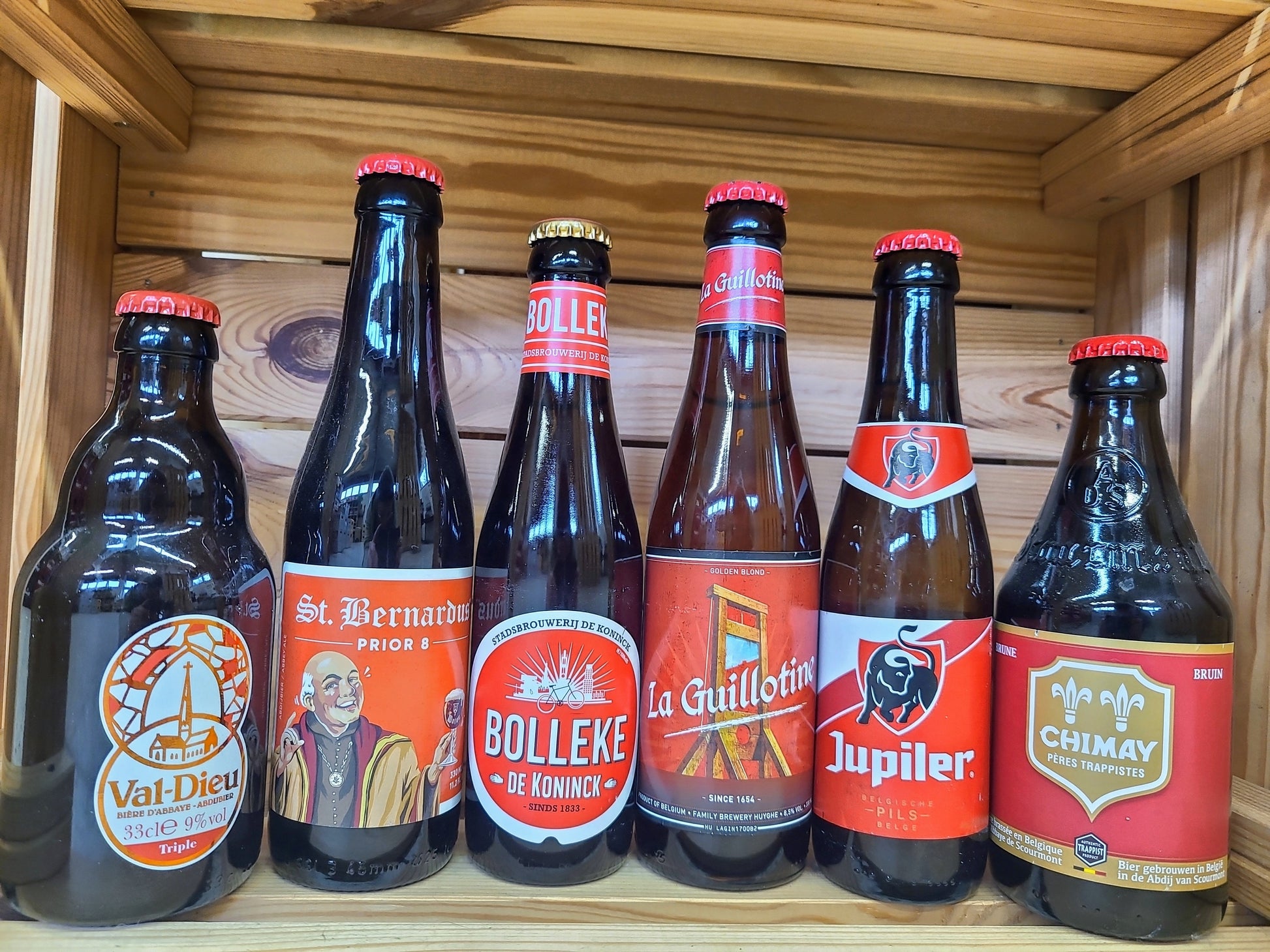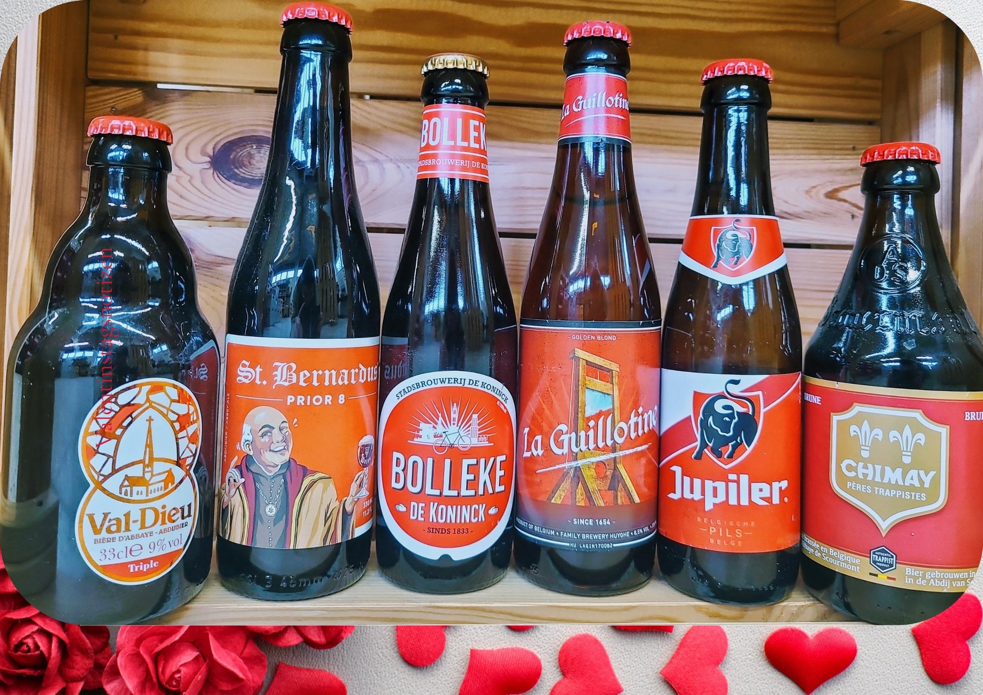 Genießen Sie zu Valentinstag diese sechs erlesenen belgischen Biere. Probieren Sie das Chimay Premiere mit seiner dezenten Süße, das traditionell bernsteinfarbene De Koninck Bolleke mit angenehmer Bitterkeit, das erfrischend milde Jupiler, das intensiv-süße La Guillotine oder das fruchtige, malzige St. Bernardus Prior 8. Abgerundet wird das Paket durch das goldene Val-Dieu Tripel mit Noten von Pflaumen, Rosinen und Schokolade.